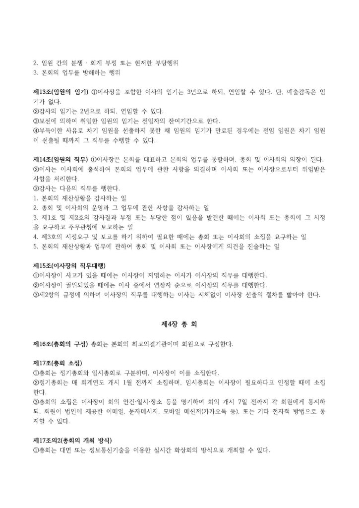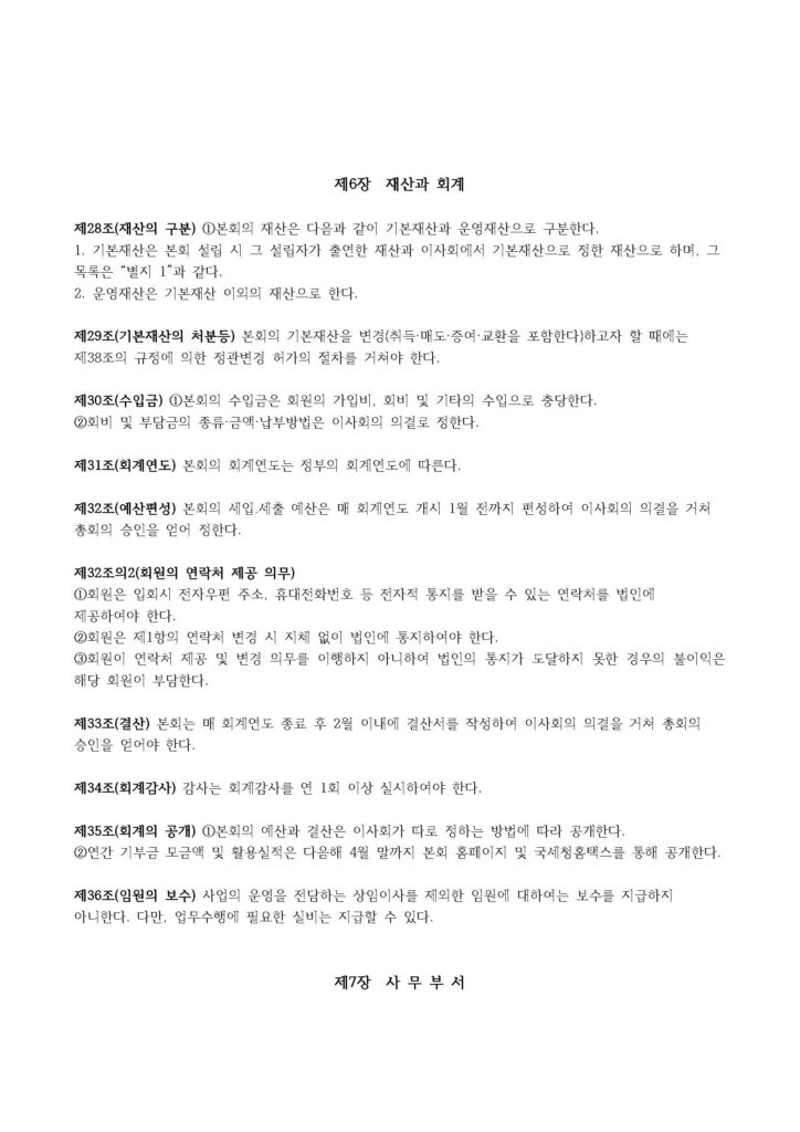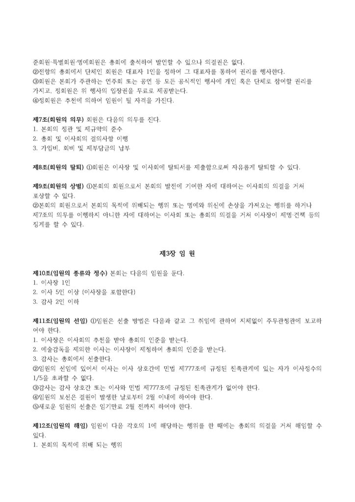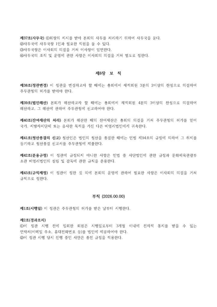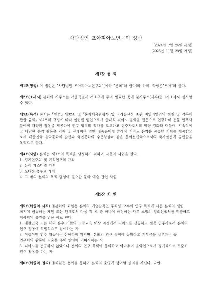 사단법인 포아피아노연구회 정관 정관 연혁2024. 07. 26 창립총회에서 정관 제정2025. 01. 06 서울특별시 사단법인 설립 허가2025. 11. 29 정기총회에서 정관 변경 의결2026. 03. 03 주무관청(서초구청) 정관 변경 허가