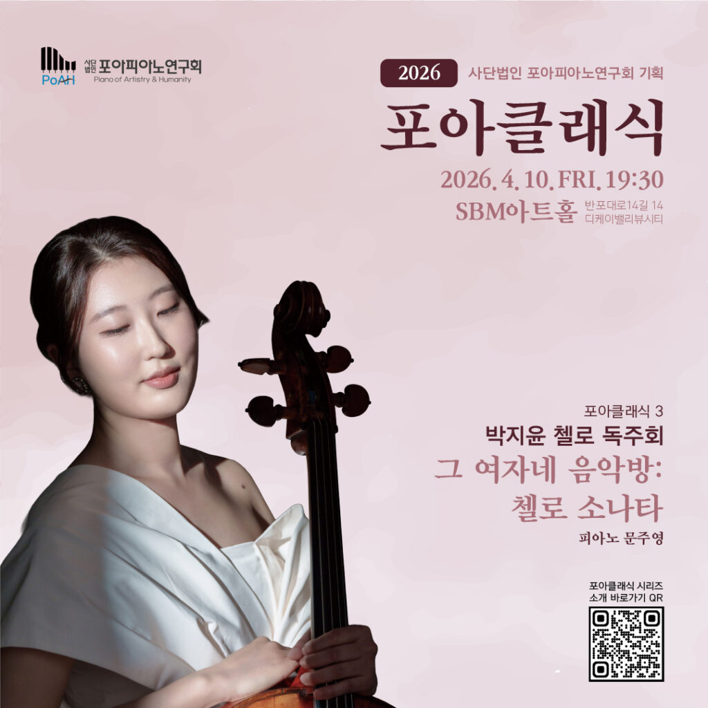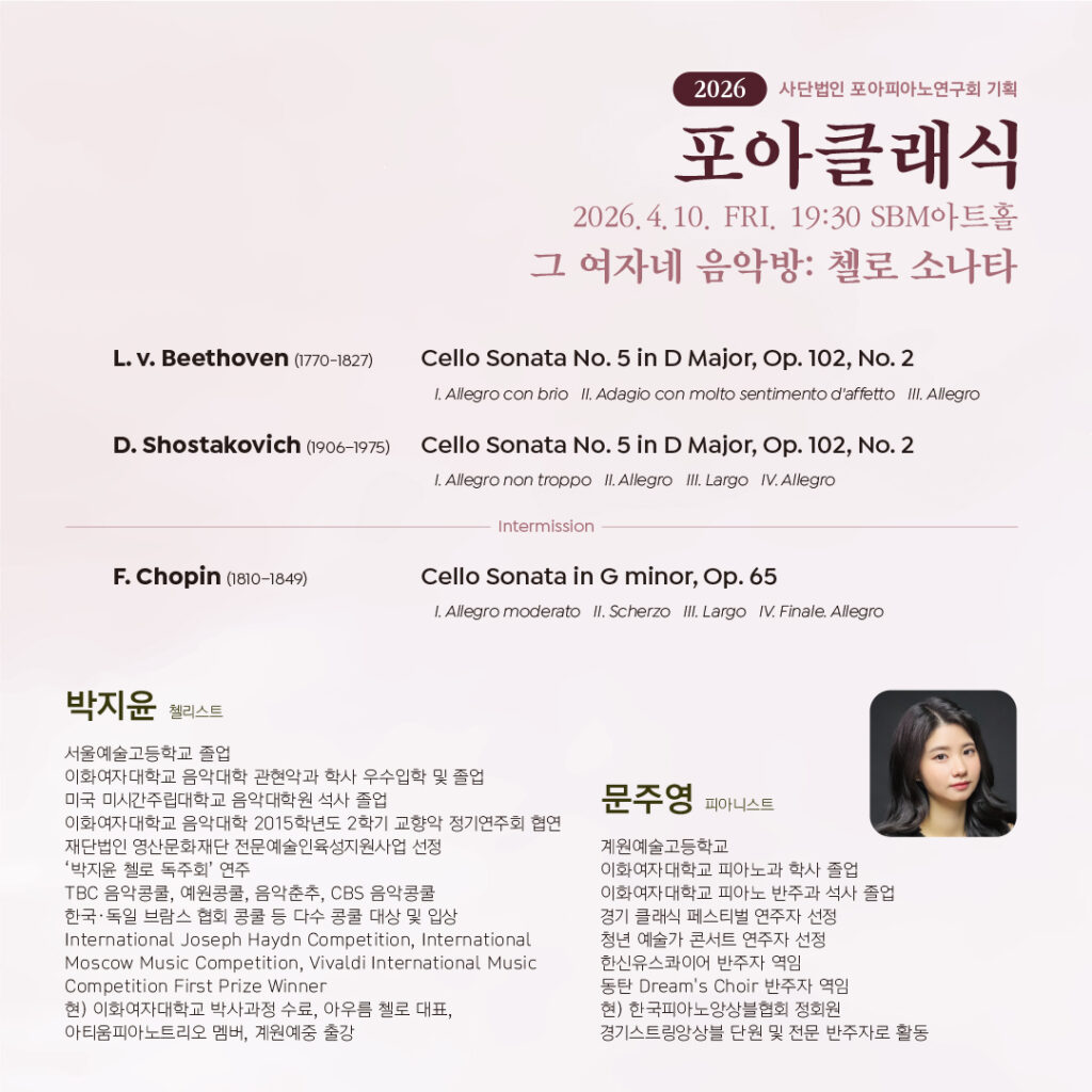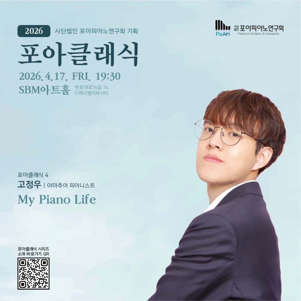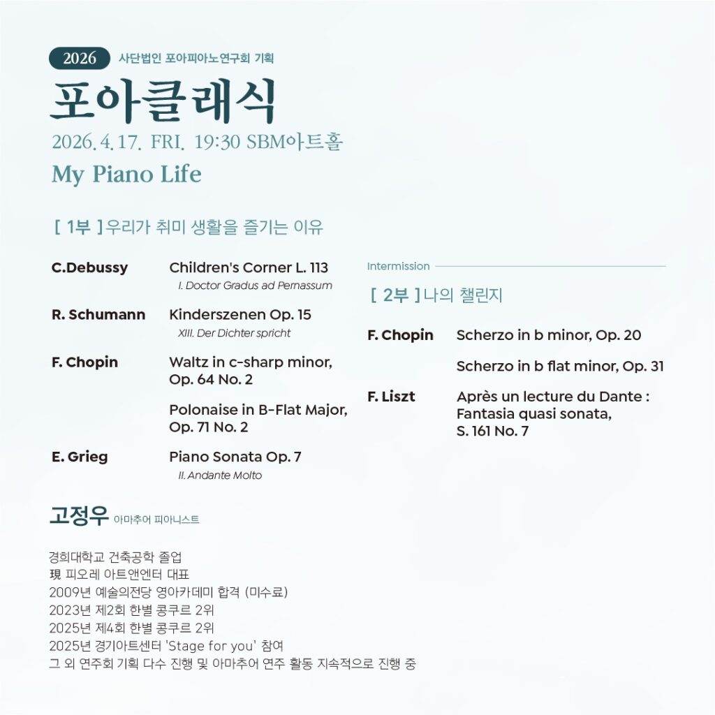 2026 포아클래식 사단법인 포아피아노연구회 기획 공연 시리즈 2026 포아클래식 사단법인 포아피아노연구회에서 선정한 10인(팀)의 연주자들의 무대가 2월부터 8월까지 펼쳐집니다. 젊은 연주자들의 아이디어가 돋보이는 다양하고 실험적인 무대를 만날 수 있는 이번 시리즈, 많은 기대와 관심 부탁드립니다!